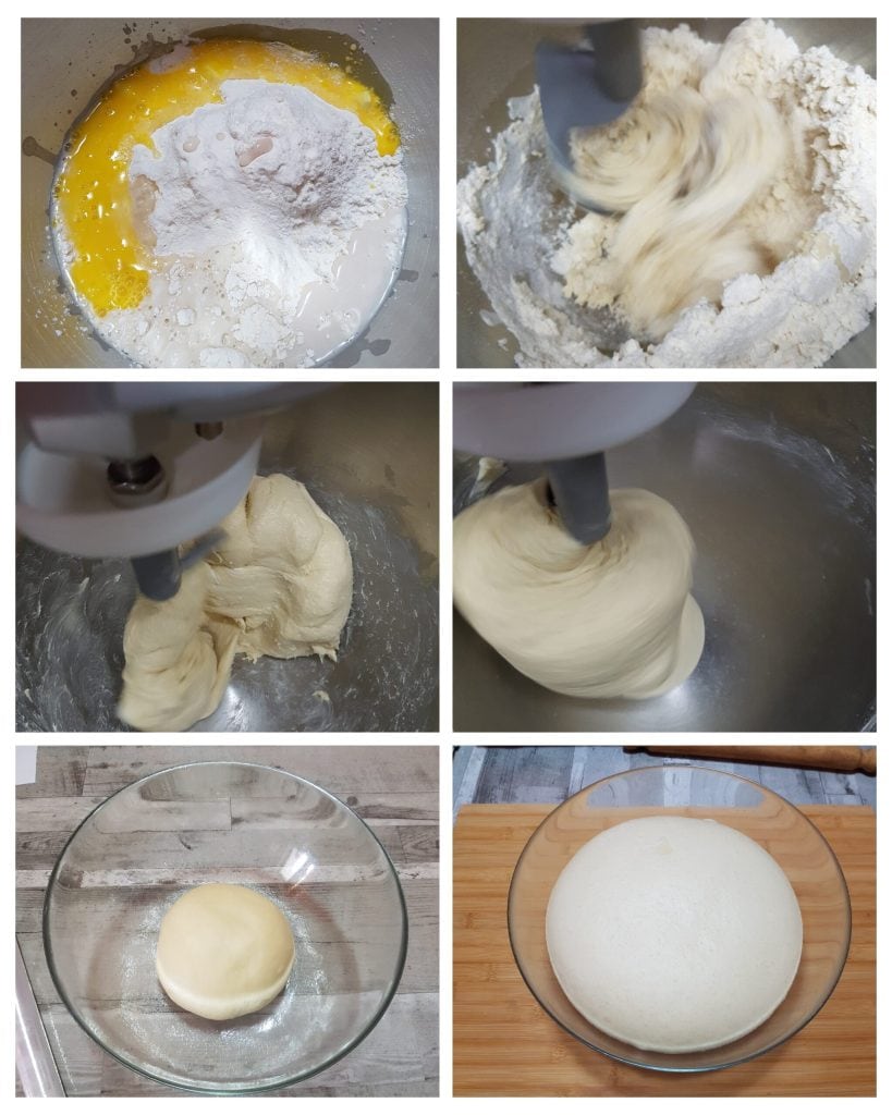 Para realizar estas deliciosas trenzas brioche saladas rellenas primero hay que preparar la masa. Para mi comodidad, he utilizado la amasadora, pero si queréis, podéis amasar simplemente a mano en un bol o utilizando cualquier otro robot de cocina. En el bol de la amasadora, insertar la harina nuvola, la levadura disuelta en dos dedos de leche y el azúcar, y amasar durante unos minutos a velocidad 1-2 usando el gancho en forma de gancho. Luego añadir el huevo y dejar amasar un poco más. A continuación, añadir la leche restante poco a poco y seguir amasando a velocidad 2. Luego añadir también la sal. Finalmente, agregar poco a poco la mantequilla en pomada o blanda en trozos, asegurándose de que se absorba bien y seguir amasando. Para obtener una masa lisa y homogénea se necesitarán aproximadamente 15-18 minutos o hasta que la masa esté bien ligada. Dejar leudar la masa en un bol grande cubierto con film transparente en el horno cerrado con la luz encendida durante unas 3-4 horas o hasta que duplique su tamaño.