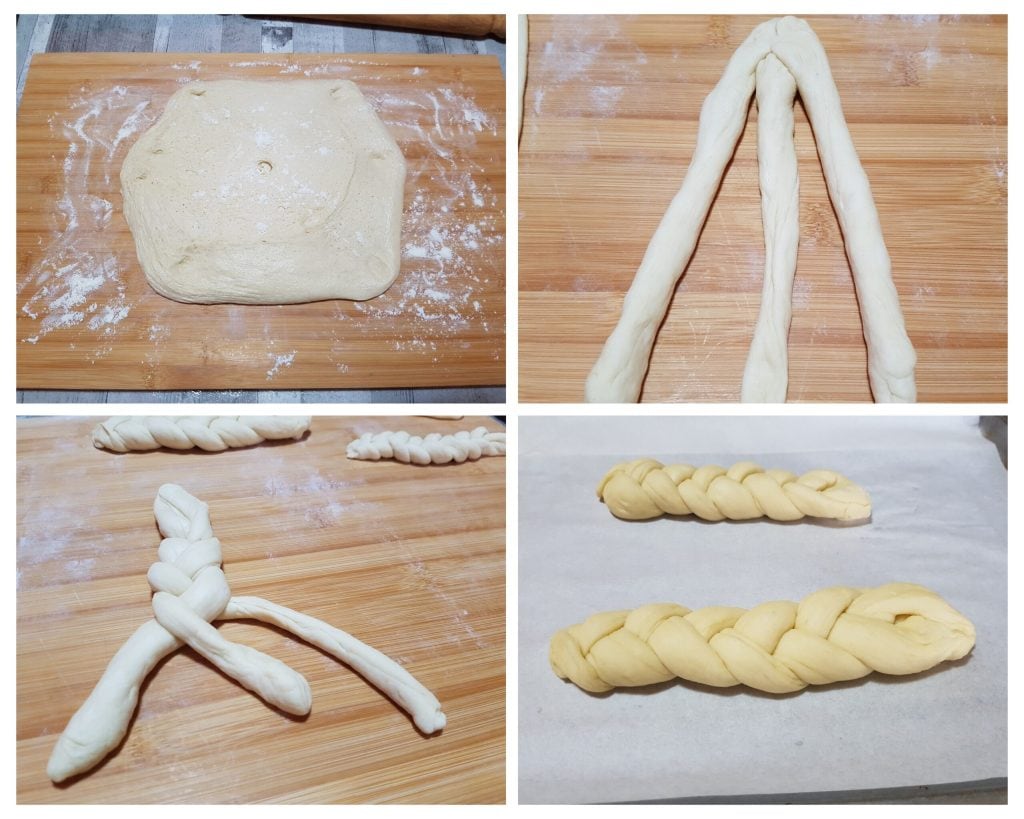 Una vez leudada la masa, en una superficie enharinada, colocar la masa de brioche, desgasificarla con las manos y formar 3 cilindros de masa y trenzar como si fuera una trenza de pelo. Dejar leudar de nuevo durante 1-2 horas, siempre en el horno apagado con la luz encendida.