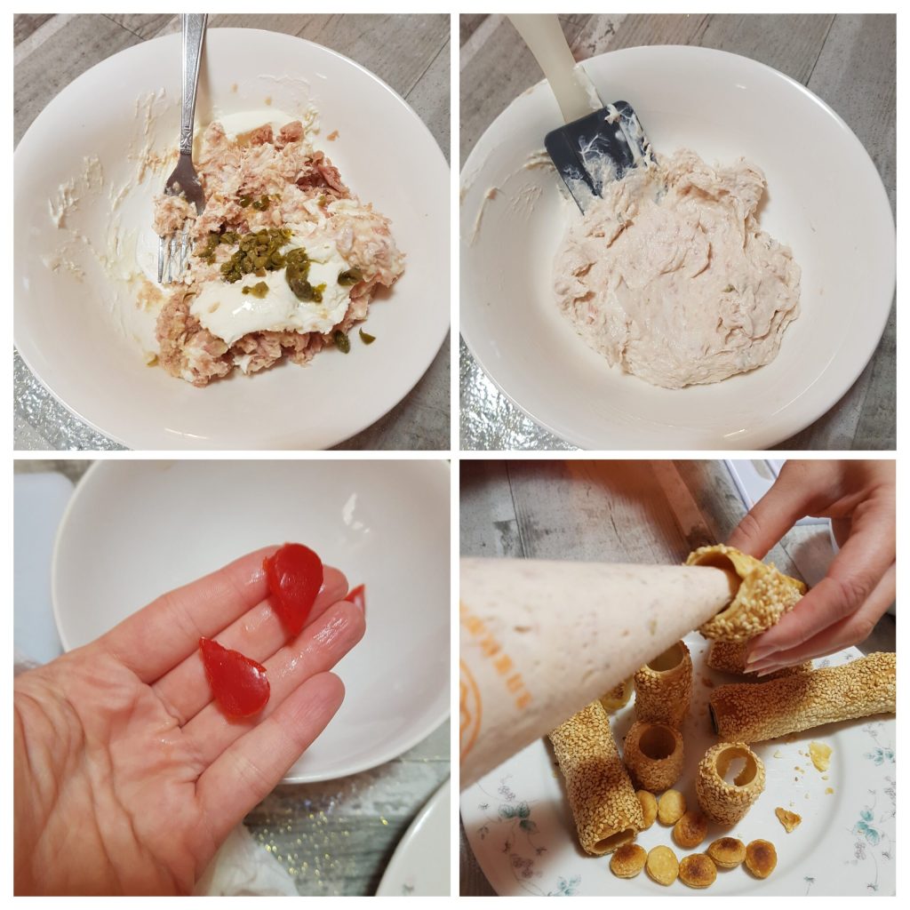 • En un bol, mezclar el queso crema untable junto con las 2 latas de atún, añadir las alcaparras picadas a cuchillo y mezclar bien hasta obtener una mezcla homogénea. Colocar el relleno en una manga pastelera y reservar. Mientras tanto, para crear las famosas «llamas» que darán un toque especial a las velas, se necesitará cortar formas de gotas utilizando un pimiento rojo. Con mucho cuidado, desmoldar las velas y rellenarlas con el relleno de atún.