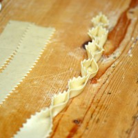 Con los dedos, unir delicadamente los dos bordes opuestos de la tira, teniendo cuidado de no aplastar demasiado la pasta para evitar romperla.