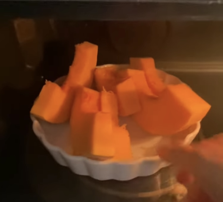 • Cocción en el microondas: Coloca los trozos de calabaza en un plato apto para microondas. Puedes colocarlos uno al lado del otro, pero evita superponerlos.
