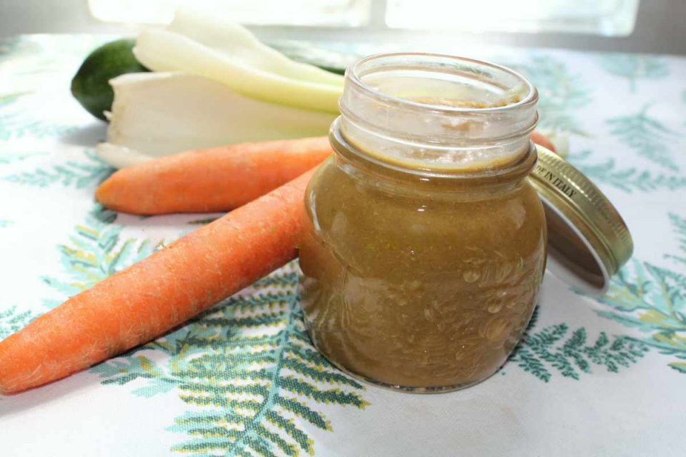 Al final de la cocción, escurrir el líquido de los ingredientes, luego triturar la carne y las verduras, añadiendo un poco de caldo, si es necesario.