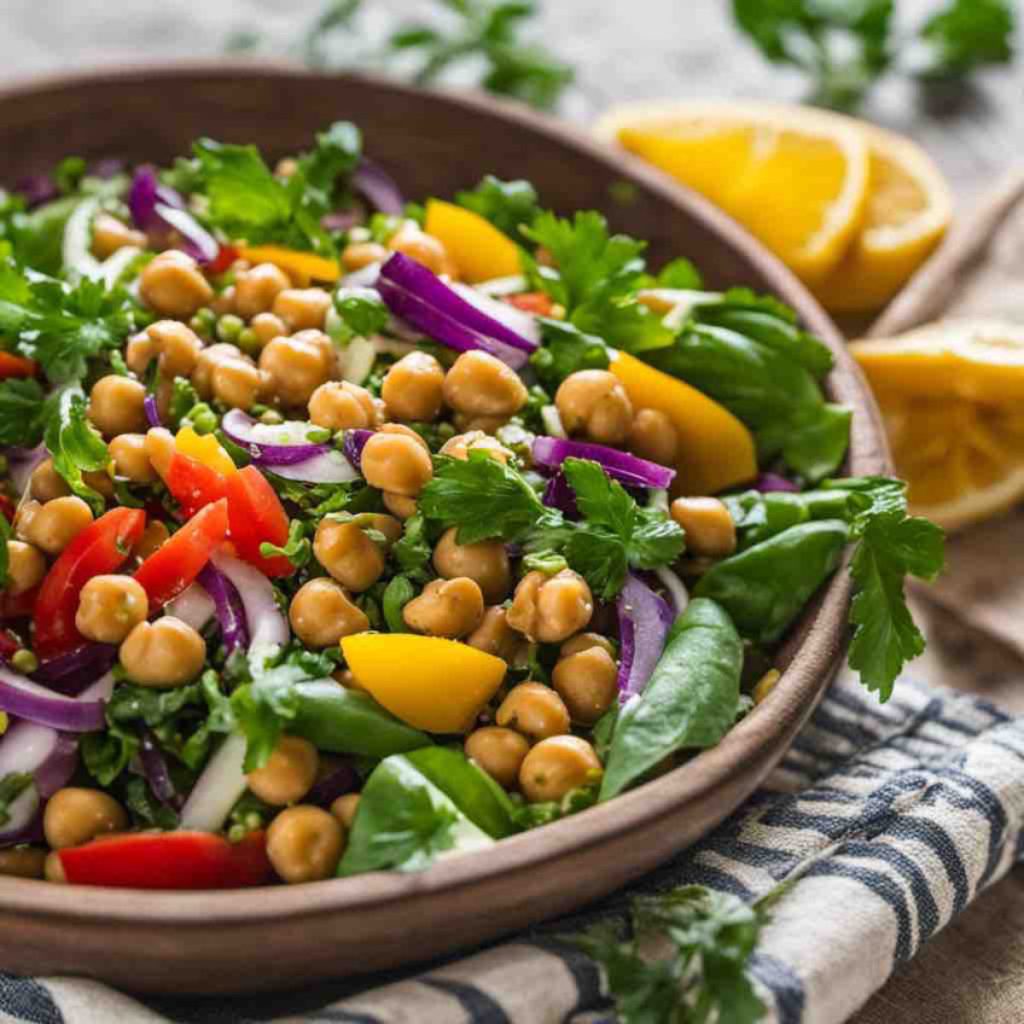 Todo se adereza con jugo de limón, aceite de oliva virgen extra, sal y pimienta, que realzan los sabores de las verduras y los garbanzos, haciendo la ensalada aún más sabrosa. Finalmente, el perejil fresco picado añade un toque de verde y un sabor fresco y herbáceo al plato.