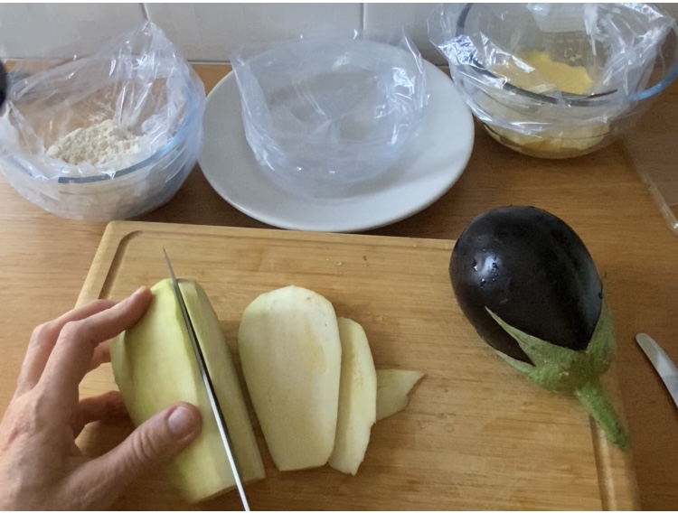 Pasa las rodajas de berenjenas por la harina, cuidando de cubrir bien cada rodaja.