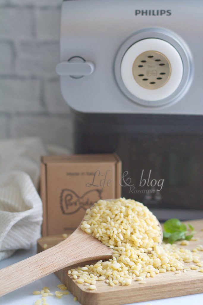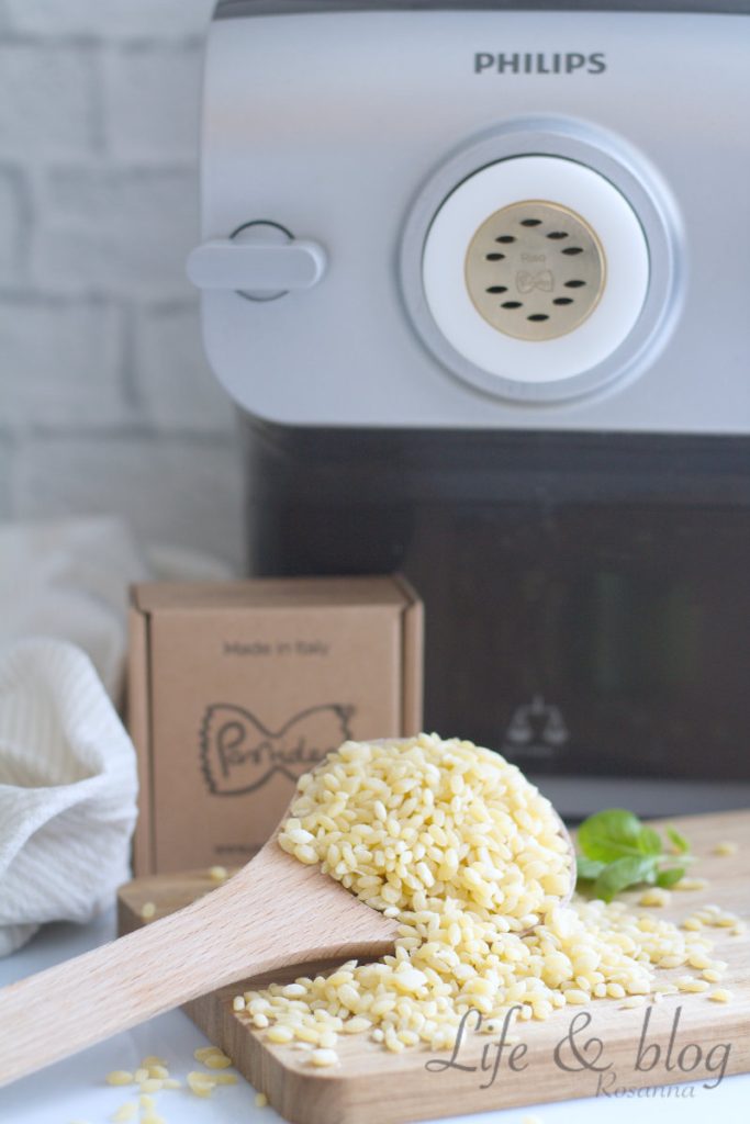 Hoy preparamos un tipo de pasta tan simple como genial. La pasta pequeña pastina o arroz con la boquilla de la empresa Pastidea. Un excelente resultado, la pasta pequeña se extruye rápidamente con una consistencia óptima. Philips Pasta Maker es una máquina digital para la preparación de pasta fresca, equipada con un motor que hace todo el trabajo por nosotros. Philips Pasta Maker dispone de un depósito para los ingredientes, en el que se introducen la harina, los huevos y otros ingredientes necesarios para la preparación de la masa. Gracias a la función de pesaje automático, la máquina dosifica de manera precisa los ingredientes, según la receta seleccionada. La máquina está equipada con boquillas intercambiables, que permiten crear diferentes formatos de pasta, como espaguetis, penne, tagliatelle, lasañas y mucho más. Además, el Philips Pasta Maker dispone de un sistema de extrusión automático, que hace salir la pasta directamente sin más manivelas. La boquilla está fabricada en bronce, un material resistente que garantiza una mayor porosidad y rugosidad a la superficie de la pasta. Esto permite que la pasta retenga mejor la salsa y absorba los sabores de los ingredientes con los que se condimenta. La boquilla de bronce se considera, por lo tanto, un elemento fundamental para obtener una pasta de calidad superior. Con Pasta Maker y la boquilla de Pastidea realizas muy rápidamente una exquisita pastina para tus maravillosas recetas, ideal para crear pastinas para nuestros niños.