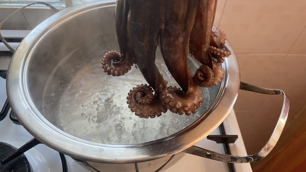 «Asusta» el pulpo sumergiéndolo en el agua hirviendo 2-3 veces (sujétalo por la cabeza). Esto ayuda a que los tentáculos se enrosquen.