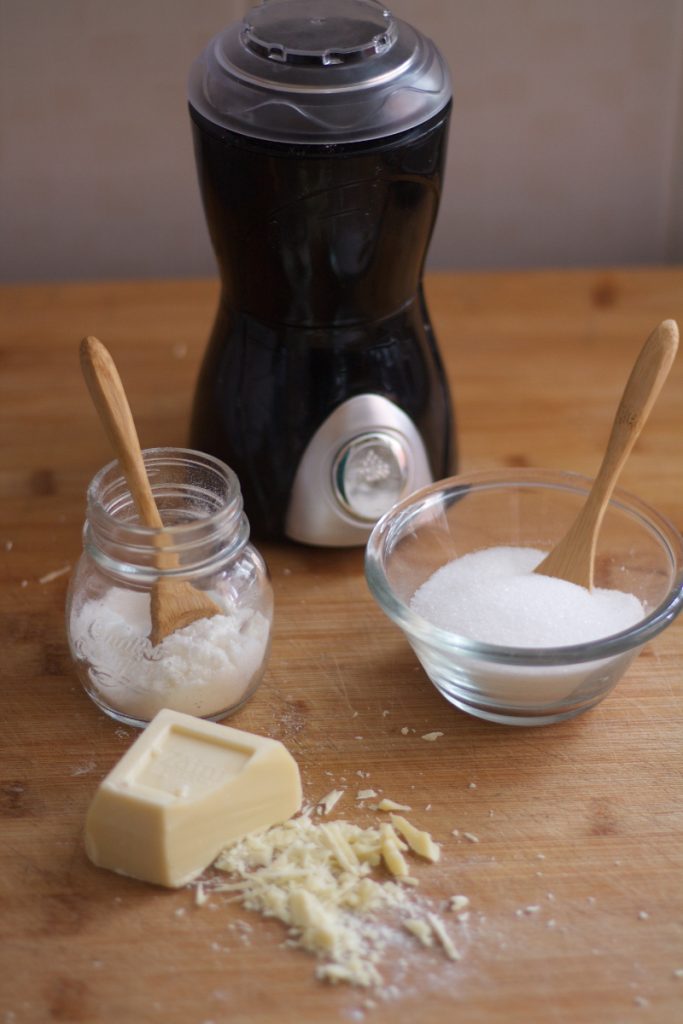 • Para preparar un delicioso chocolate caliente blanco, comienza rallando delicadamente el chocolate blanco con un rallador de malla fina. Si lo prefieres, puedes utilizar un picador potente, asegurándote de no sobrecalentar el chocolate. Luego, recoge el chocolate rallado en un bol junto con el almidón de maíz y, si lo deseas, el azúcar. Mezcla cuidadosamente los ingredientes para obtener una buena amalgama de los polvos.