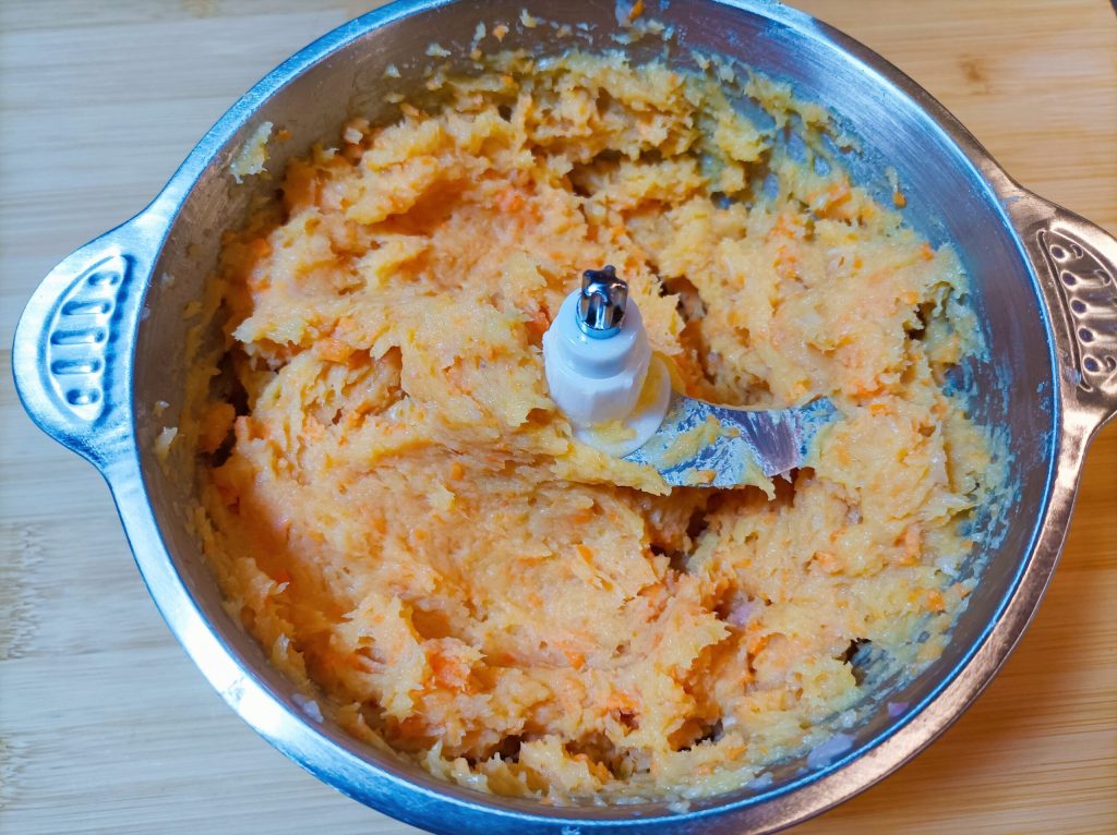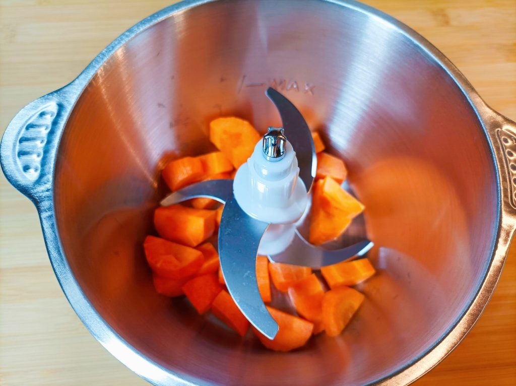 Lava la zanahoria y córtala en trozos; métela en la picadora.