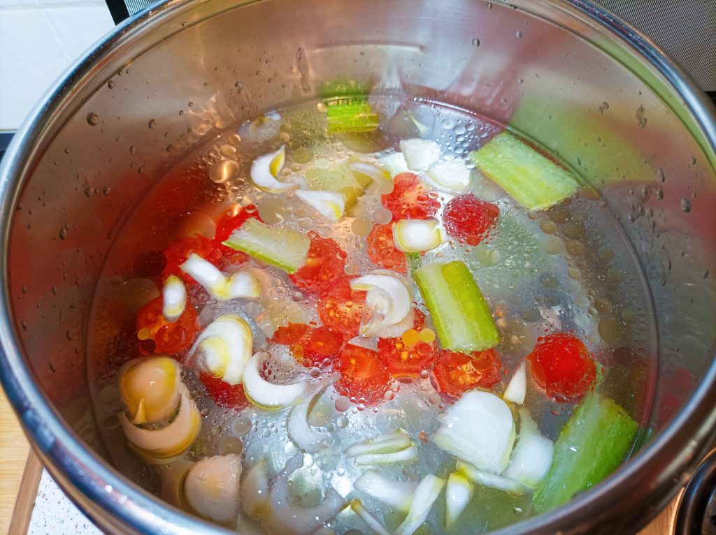 Prepara el caldo poniendo un chorrito de aceite, cebolla, apio, sal, tomatitos y agua. Cocina tapado durante 40 minutos.