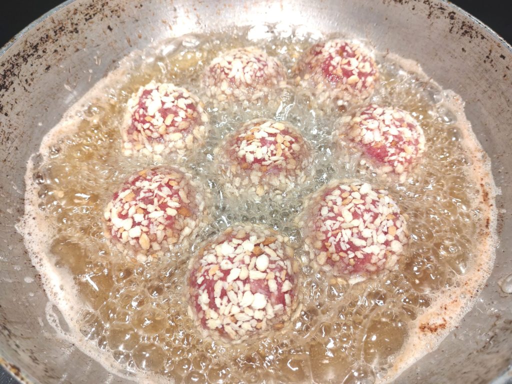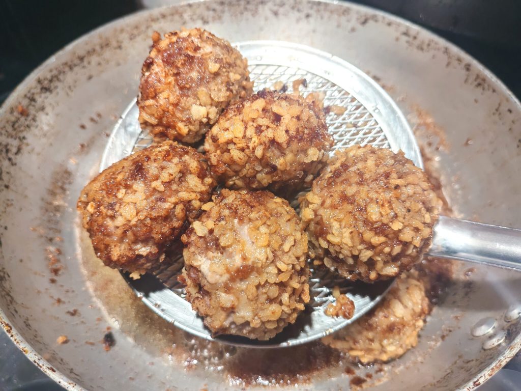 Poned el aceite en la sartén, llevadlo a 180° e introducid las albóndigas, cocedlas durante unos 5 minutos girándolas apenas empiecen a dorarse por un lado. No las saquéis demasiado rápido, de lo contrario el queso en el interior no se derretirá bien.