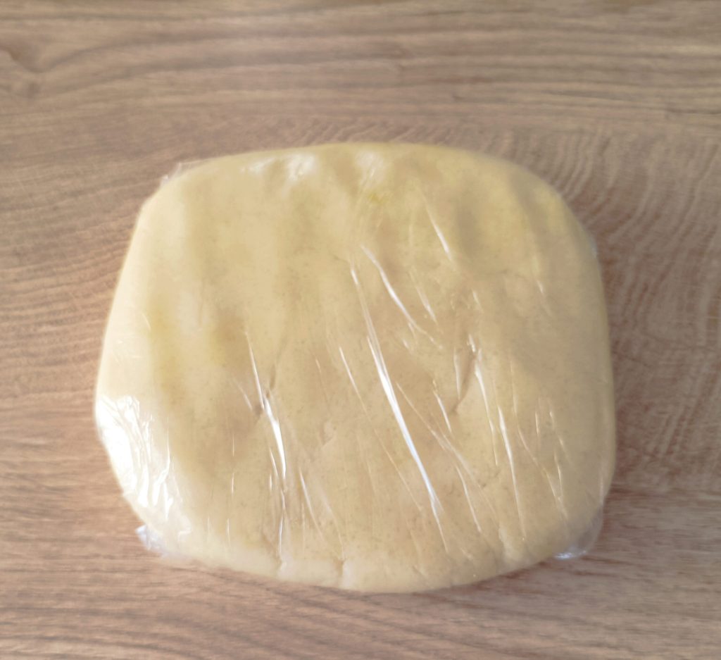 En pocos segundos la masa estará lista. Colócala sobre una superficie, hazla uniforme y envuélvela en film, déjala reposar en la nevera 30 minutos, (si se queda más tiempo no pasa nada).