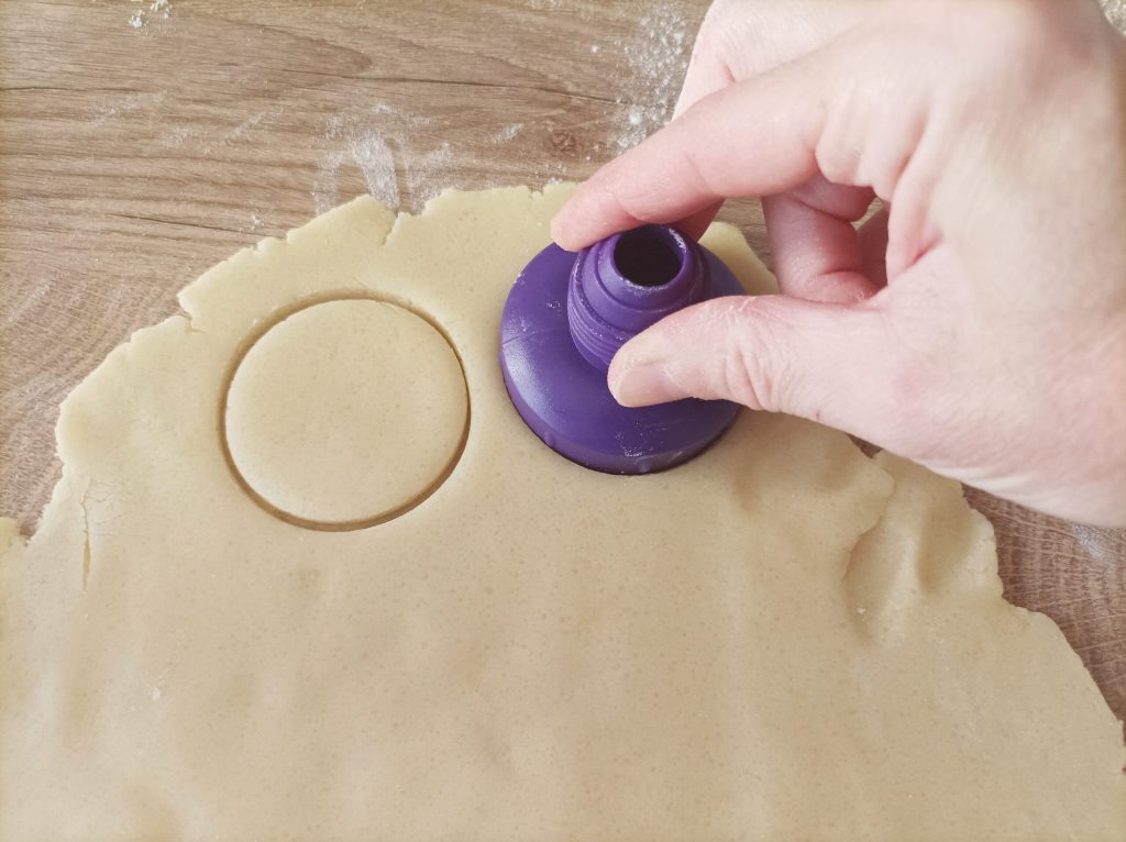 Con el molde o cortapastas, forma círculos que te servirán para la base y la cubierta del bocconotto. Retira el contorno de la masa alrededor de los círculos, si quieres usa una rasqueta para despegar el círculo de masa.