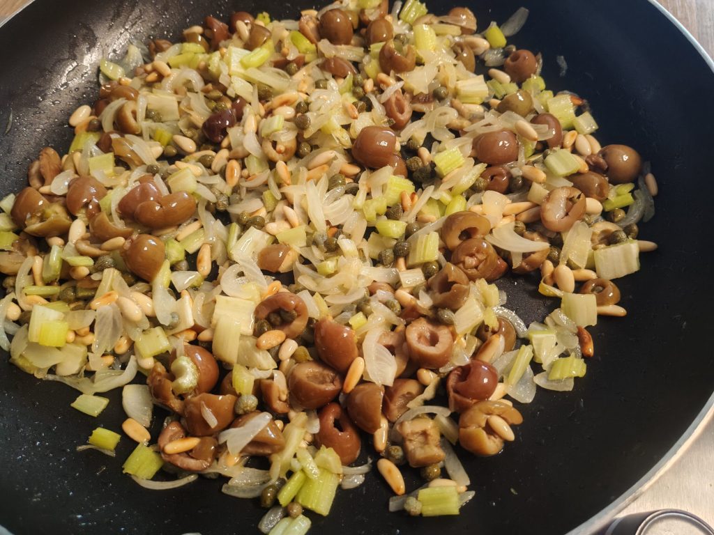 • Luego añade las aceitunas, las alcaparras y los piñones.