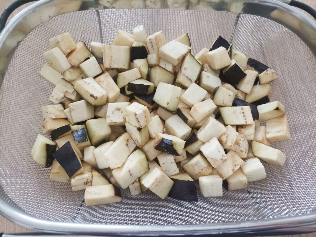 • Comienza con las berenjenas, lávalas y córtalas en trozos, ponlas en un colador con un poco de sal y déjalas reposar durante unos 30 minutos. Soltarán un poco de agua de vegetación para eliminar el sabor amargo. Pasado el tiempo de reposo, lávalas para eliminar la sal y sécalas con papel absorbente o pasándolas por una centrifugadora de ensalada.