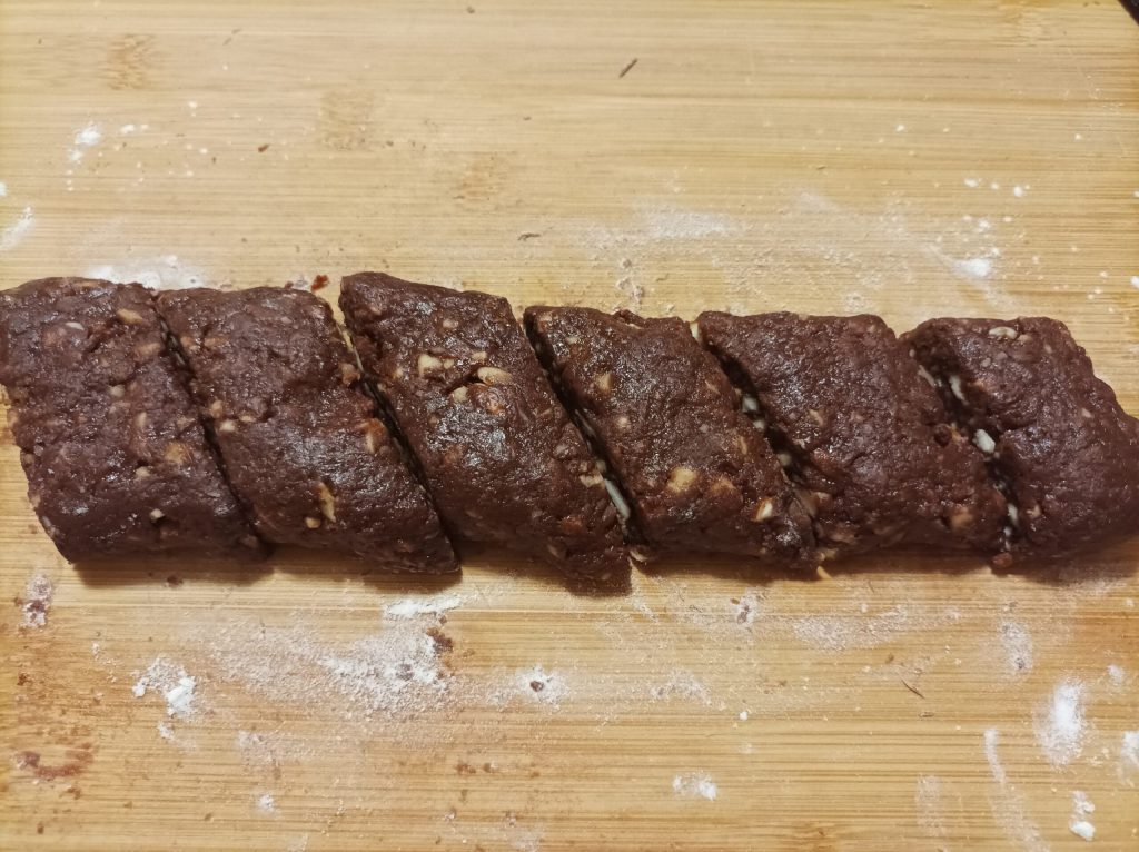 Forma un cilindro, luego aplástalo ligeramente. En este punto podrás cortar las castagnelle dándoles la clásica forma de rombo.