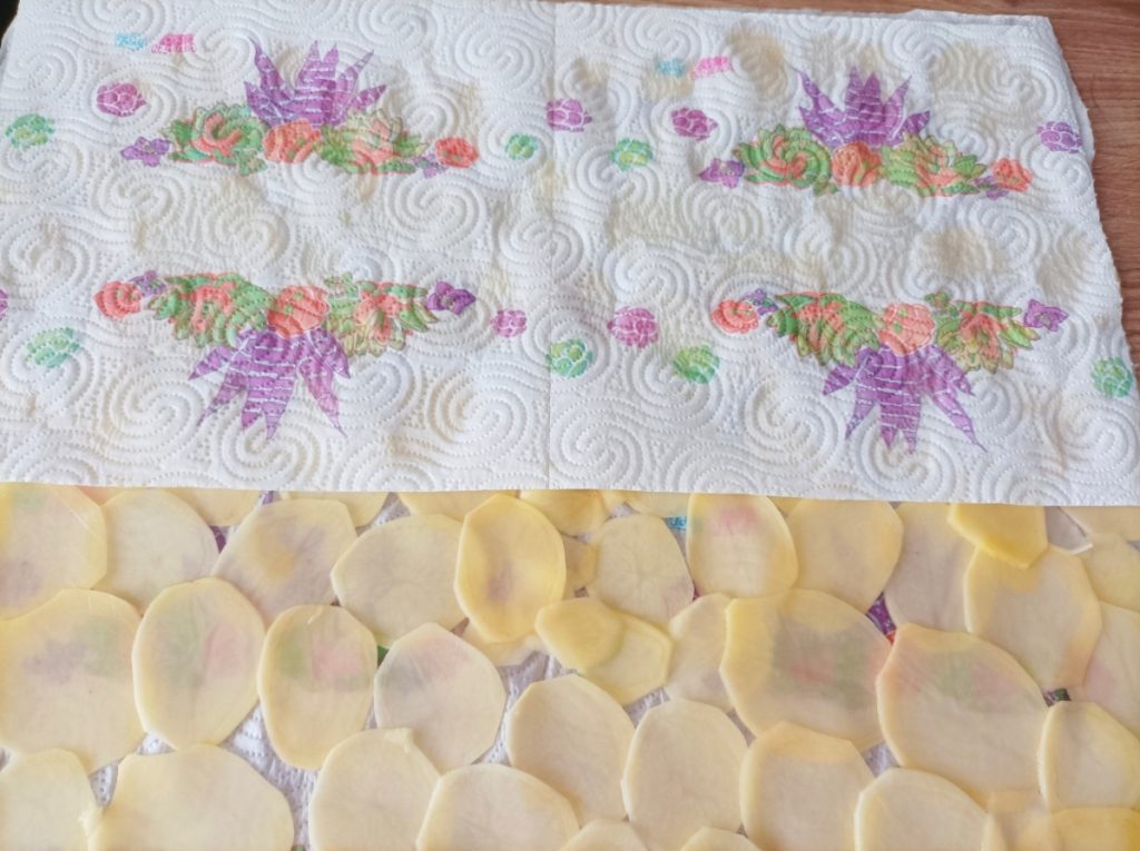 Primero limpia y corta las patatas preferiblemente con una mandolina para tener el mismo grosor y cortarlas muy finas.