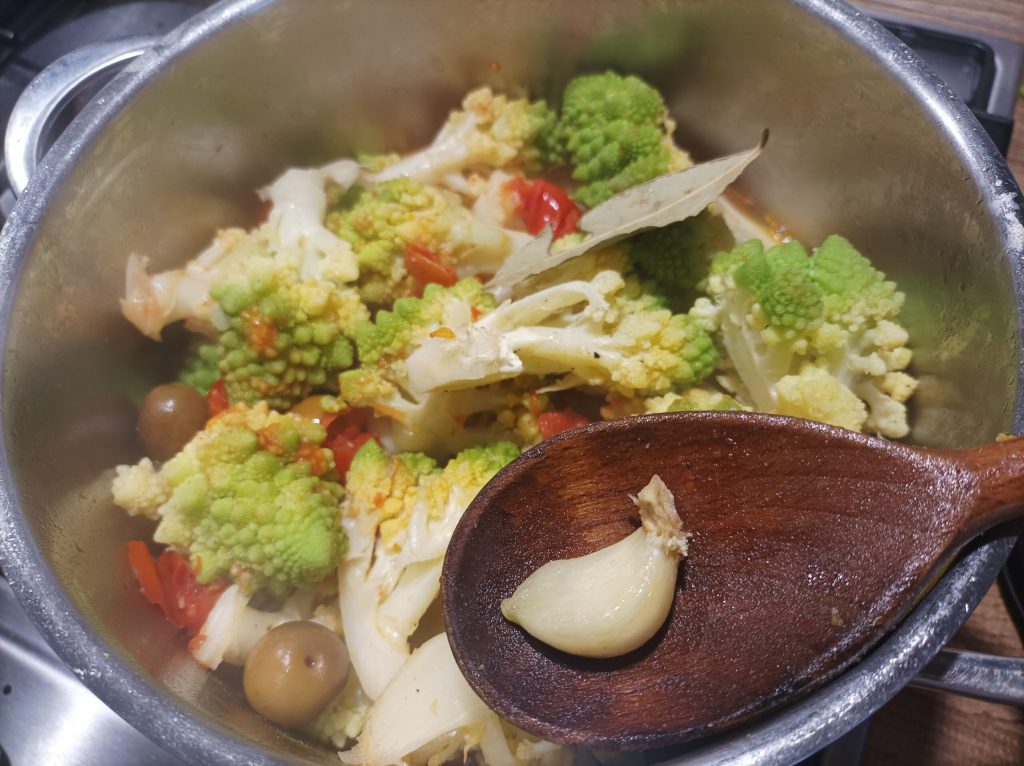Luego elimina el ajo y si prefieres añade un poco de cúrcuma fresca rallada. Continúa la cocción por 20 minutos. Pasado el tiempo, prueba de sal y con un tenedor verifica la cocción pinchando el tallo de la col, si está blando, las coles guisadas estarán listas.