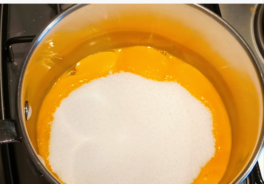 En otro cazo coloca las yemas y el azúcar, remueve luego añade el almidón de maíz y deja que se absorba.