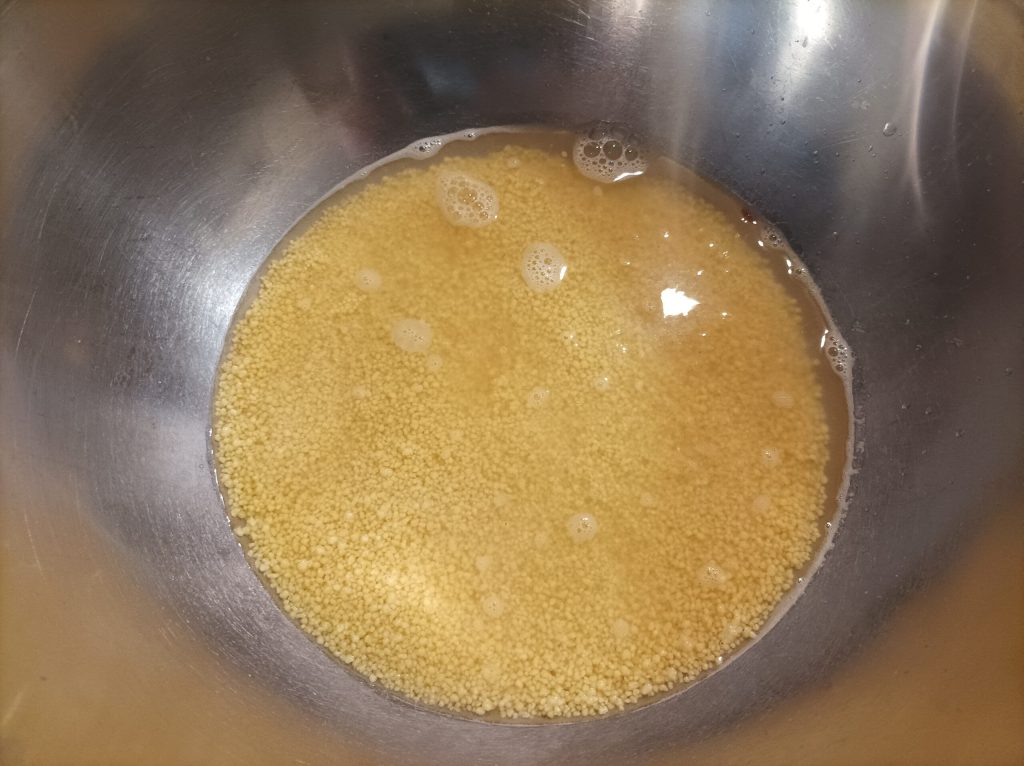 En un recipiente prepara el cuscús y vierte el caldo, el doble de la cantidad del cuscús, cubre y deja que «se infle», notarás que estará listo cuando absorba todo el líquido. En este punto tendrás que desgranarlo con los dientes de un tenedor.