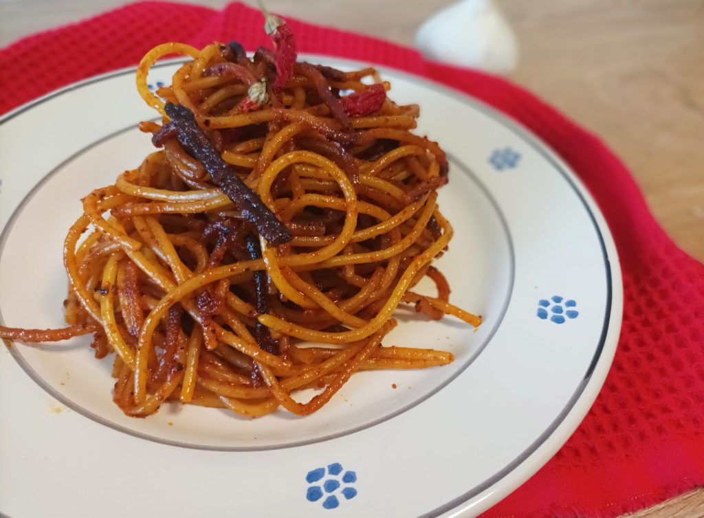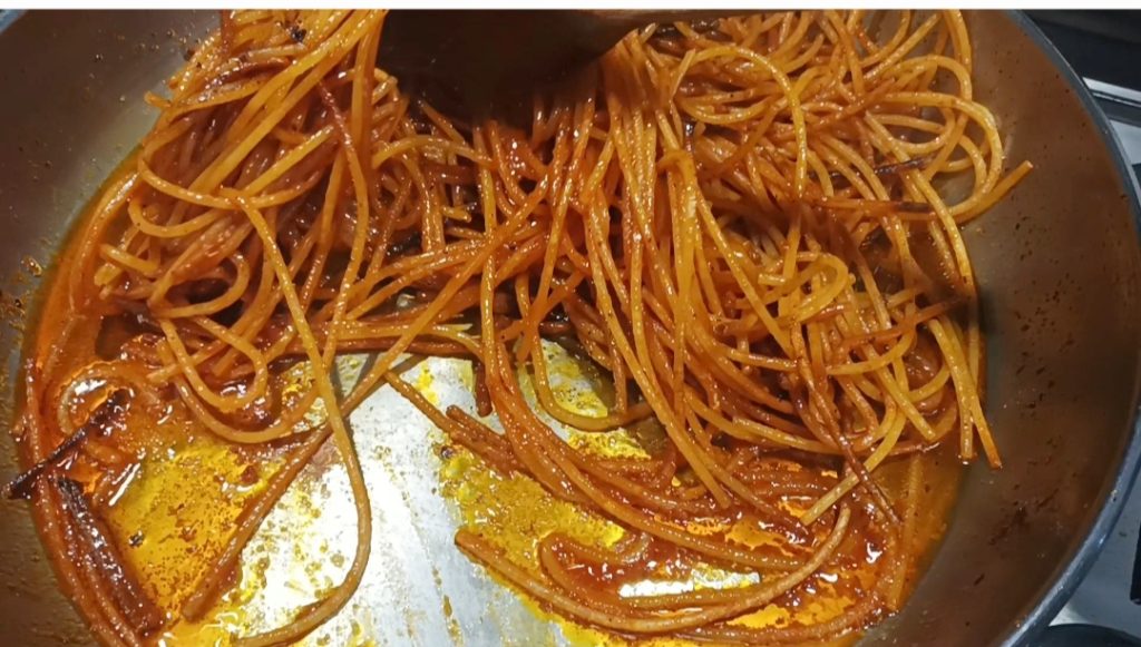 Espaguetis a la ‘assassina’ otro plato típico de Bari, aunque no pertenece a la cocina tradicional. En los últimos años se ha convertido en el más solicitado en los restaurantes de Bari. Esta receta nació por iniciativa de un chef que trabajaba en un restaurante barese, cuando clientes del norte le pidieron un plato sabroso y contundente. El nombre «assassina» fue «sugerido» precisamente por estos señores, que, refiriéndose a la generosa cantidad de guindilla del plato, le dijeron al chef: riquísimos, pero eres un «asesino». Los espaguetis a la ‘assassina’ llevan ingredientes muy simples: concentrado de tomate, ajo, aceite y guindilla, pero la especialidad está en la cocción, que se hace directamente en sartén de hierro, dándoles un acabado dorado, crujiente y extraordinariamente sabroso. ¡Pruébalos y te sorprenderán! ¡Buen provecho!