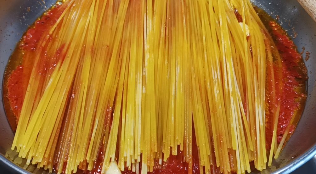 Cuando la passata empiece a freírse, pon los espaguetis en la sartén.