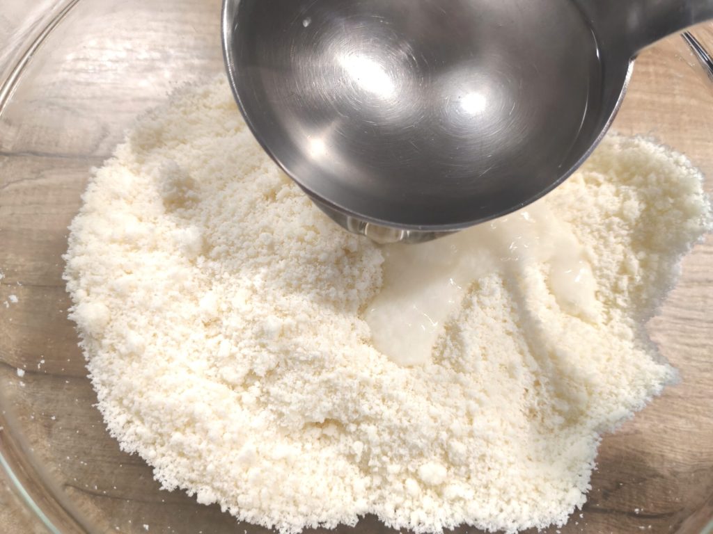 La proporción de agua con el pecorino es de 1 a 2, por lo que en 200 g de pecorino utilizarás 100 ml de agua.
