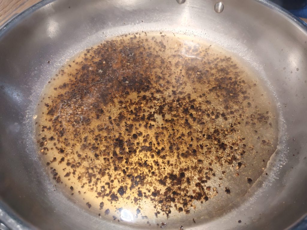 Cuando hayas terminado de moler la pimienta, ponla en la sartén y tuéstala a fuego mínimo durante 2 minutos. Luego añade 2 cucharones de agua caliente (la misma de los espaguetis).