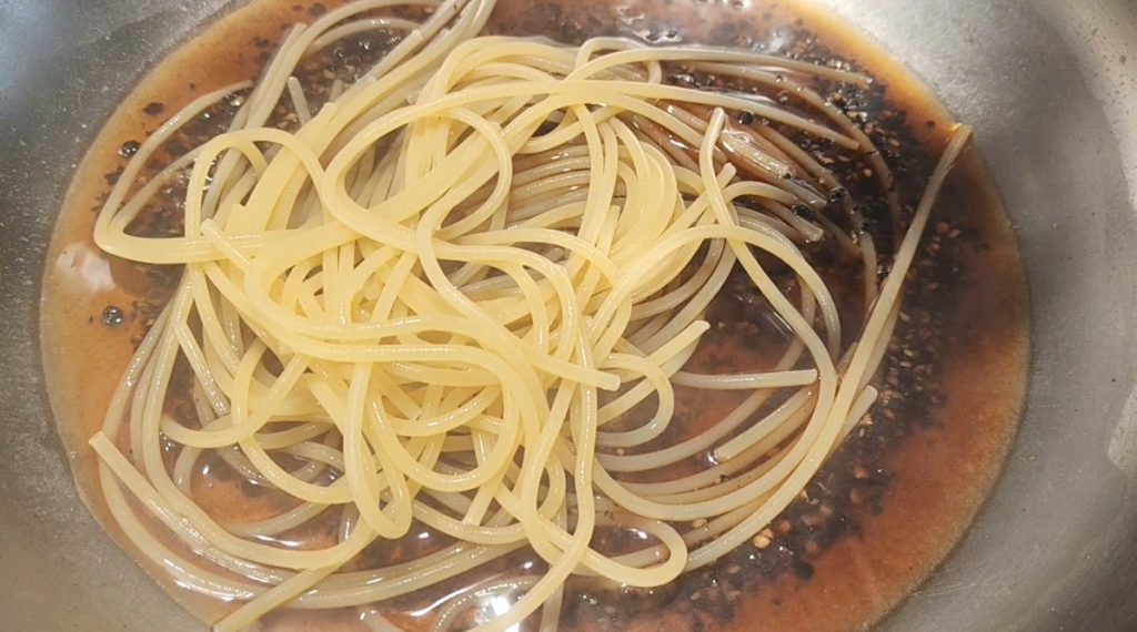 Escurre los espaguetis 3/4 minutos antes del término de la cocción y agrégalos a la sartén con la pimienta, en este punto remueve los espaguetis y si es necesario añade un poco más de agua de cocción.