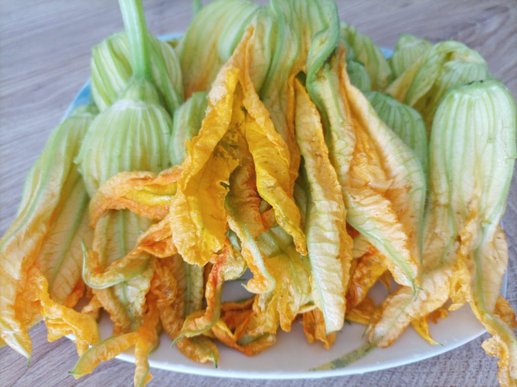 Fantásticos los flores de calabacín fritos super crujientes y deliciosos con un sabor delicado, servidos como aperitivo son perfectos. Si aún no los habéis probado, debéis hacerlo absolutamente. La preparación es muy sencilla solo con harina y agua con gas y en pocos minutos están listos, creo que es la forma más sencilla y buena de poder disfrutarlos. Para la masa hay diferentes variantes, por ejemplo, hay quien la hace con agua, harina y levadura, o bien, agua, harina y yema de huevo o harina y cerveza, en fin, cada uno puede elegir lo que más le guste… Los meses ideales para apreciar esta verdura son de mayo a julio. En este punto solo os queda probarlos!!