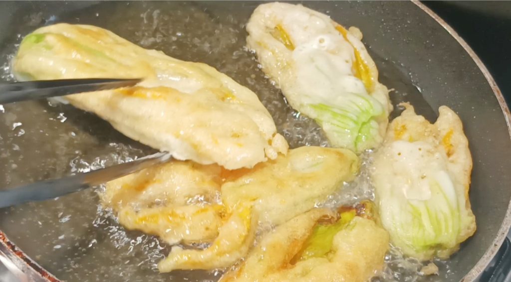 Ahora pasa a la fritura. En la sartén pon el aceite y caliéntalo hasta 170°, sumerge las flores de calabacín en la masa y sumérgelas en el aceite.