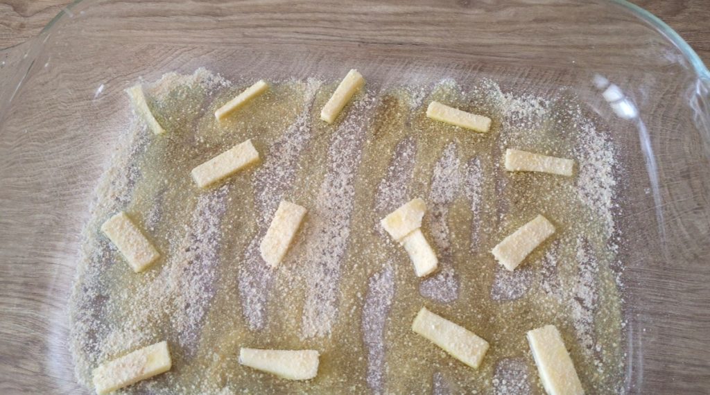 En la fuente, pon aceite, mantequilla en rodajas y pan rallado.