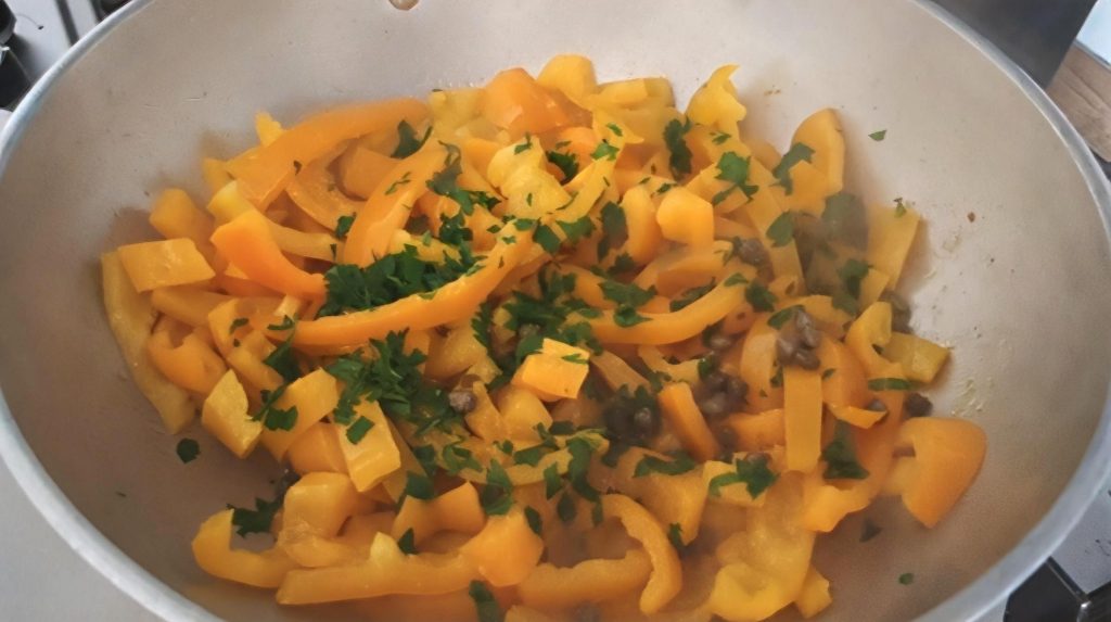 Cuando el aceite esté bien caliente, añade los pimientos, la sal, la pimienta, el perejil y las alcaparras. Cubre y cocina durante 10/15 minutos. Mientras tanto, escalda la pasta.
