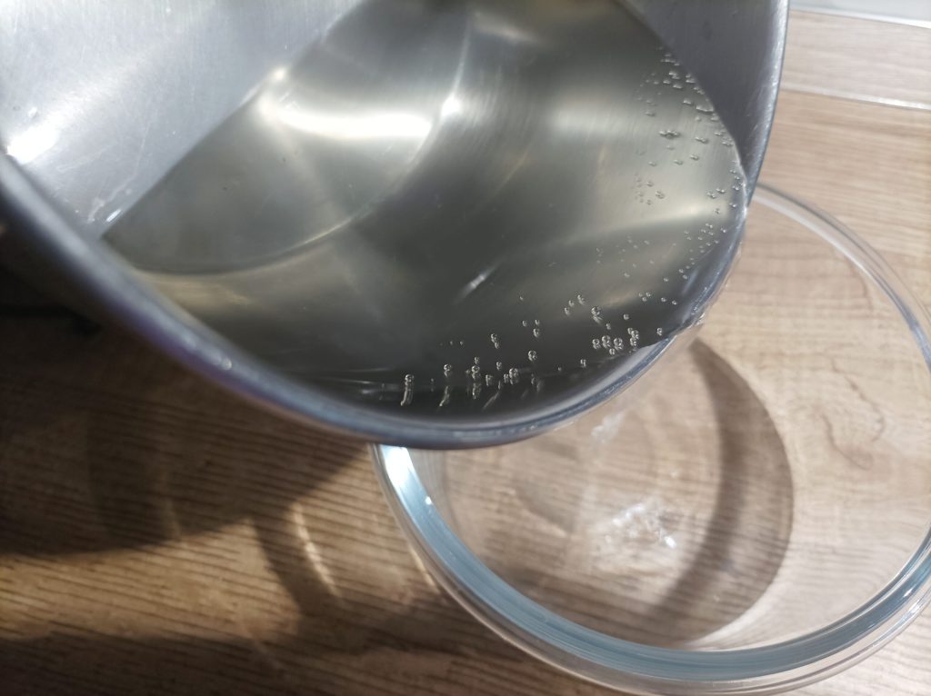 Vierte en un recipiente de vidrio y deja enfriar. Al principio parecerá un poco líquido, pero al enfriarse se volverá más denso.