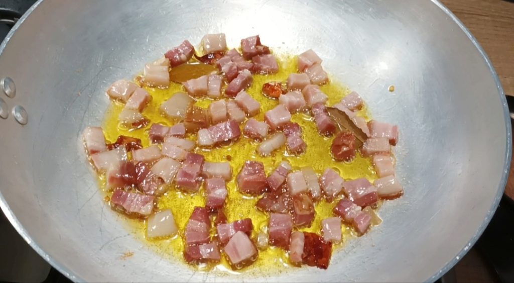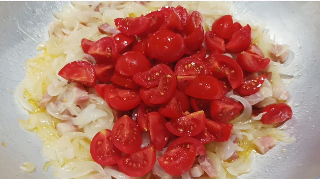 Después añade el bacon y sofríe unos minutos, luego agrega las cebollas, cubre, baja el fuego al mínimo y deja que se ablanden durante unos 25 minutos.