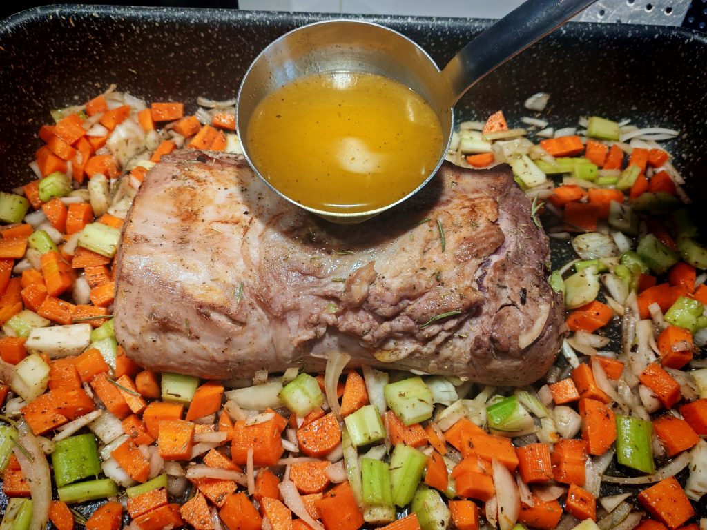Ahora prepara el condimento para hornear el lomo. En la bandeja de horno pon, el jugo que se habrá formado en la sartén, un hilo de aceite, las verduras cortadas, un poco de sal, y todas las especias indicadas en los ingredientes. Añade 2 cucharones de caldo y hornea a 200° en horno caliente durante 35 minutos. Durante la cocción gira el lomo un par de veces y si se seca demasiado añade un poco de caldo.