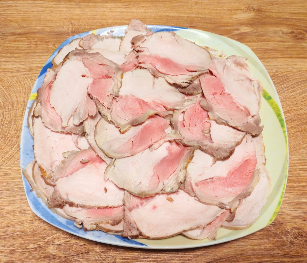 Toma nuevamente el trozo de lomo y córtalo en rodajas finas, (posiblemente con una cortafiambres), coloca las rodajas en un plato para servir y condimenta con la salsa bien caliente.