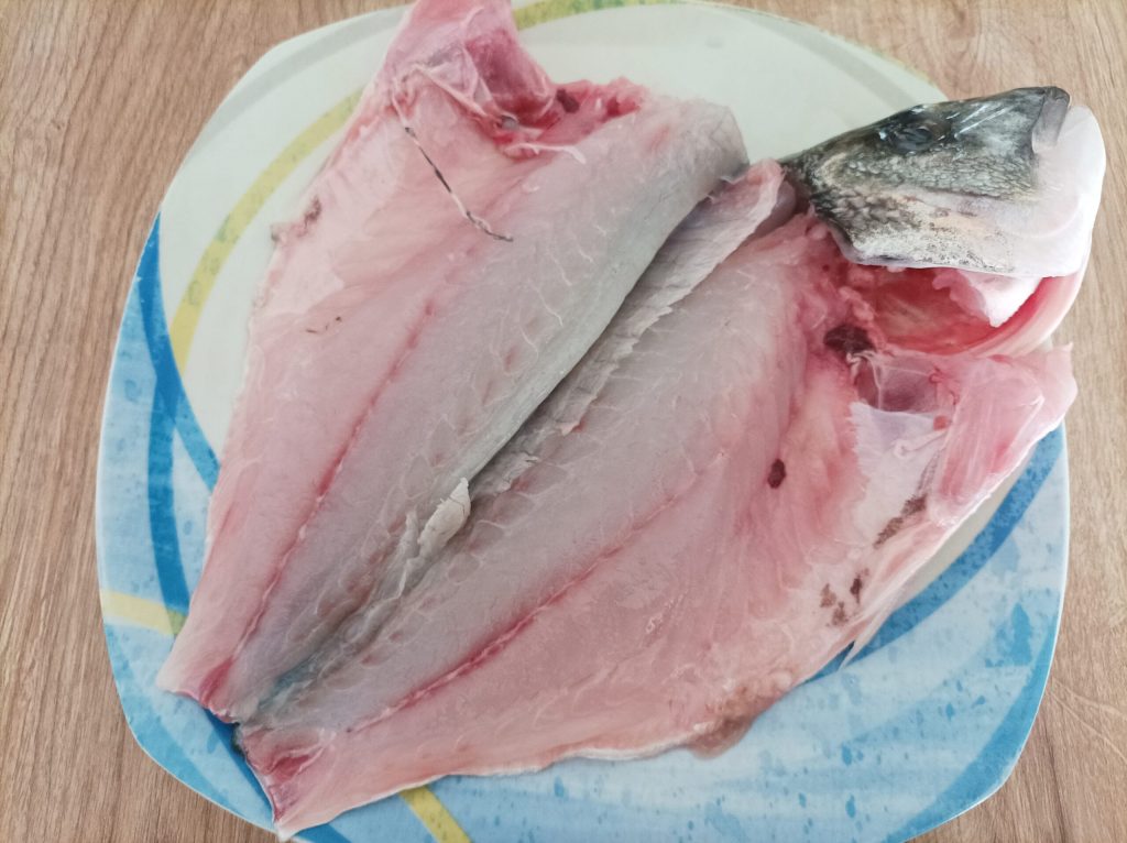 Primero hay que limpiar y filetear la lubina. Esta es una operación un poco particular, por lo que para tener un pescado fileteado de la mejor manera es preferible que lo haga tu pescadero, como hice yo, pero si quieres puedes intentarlo tú mismo.