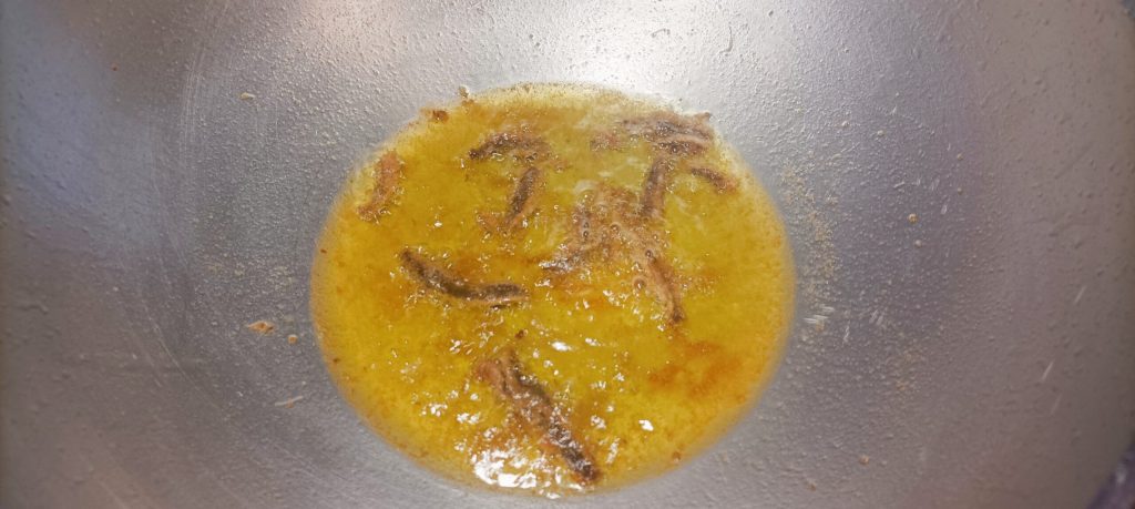 Mientras las orecchiette se cocinan, en una sartén pon aceite hasta cubrir el fondo y las anchoas, sofríe.