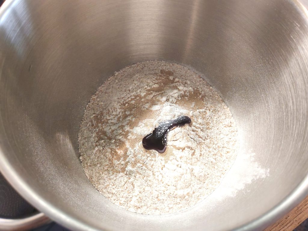 En la amasadora, pon la harina, la levadura y la malta. Activa la máquina a una velocidad media/baja y añade el agua tibia poco a poco, dando tiempo a la harina para absorber. Cuando haya absorbido toda el agua, añade la sal, trabaja por 2 minutos más.