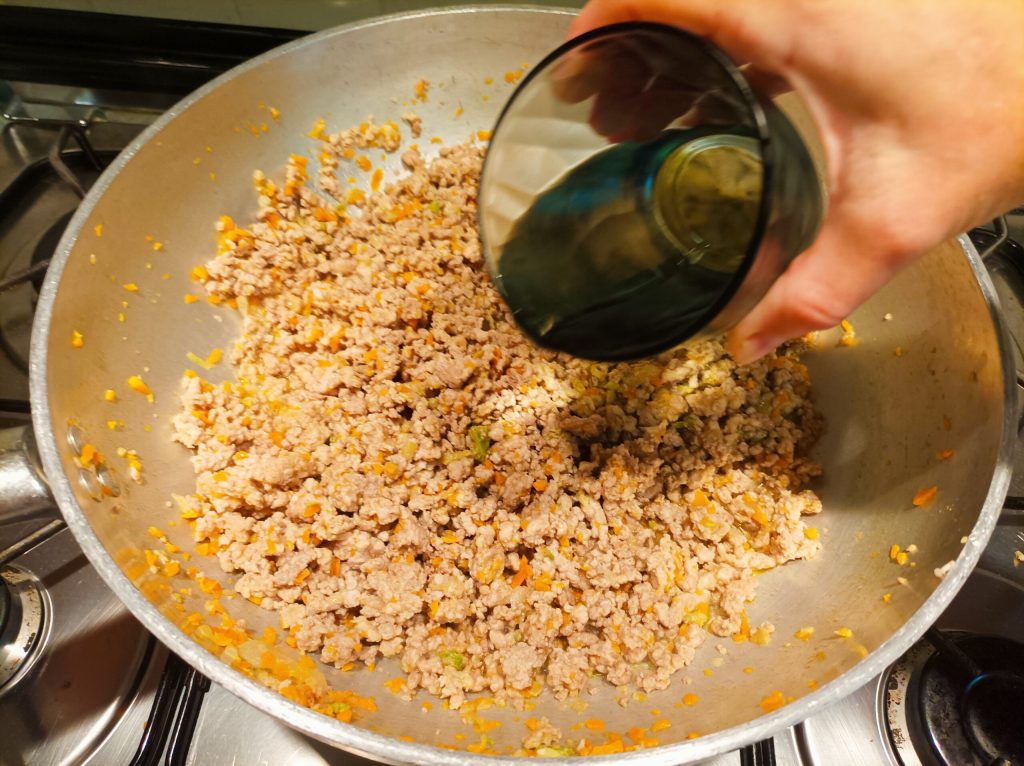 Sube el fuego y desglasa con el vino, añade el ajo y la hoja de laurel, luego baja el fuego. Mientras tanto, limpia los boletus, si quieres puedes pasarlos rápidamente bajo el agua, luego sécalos, córtalos en rodajas e incorpóralos a la carne.
