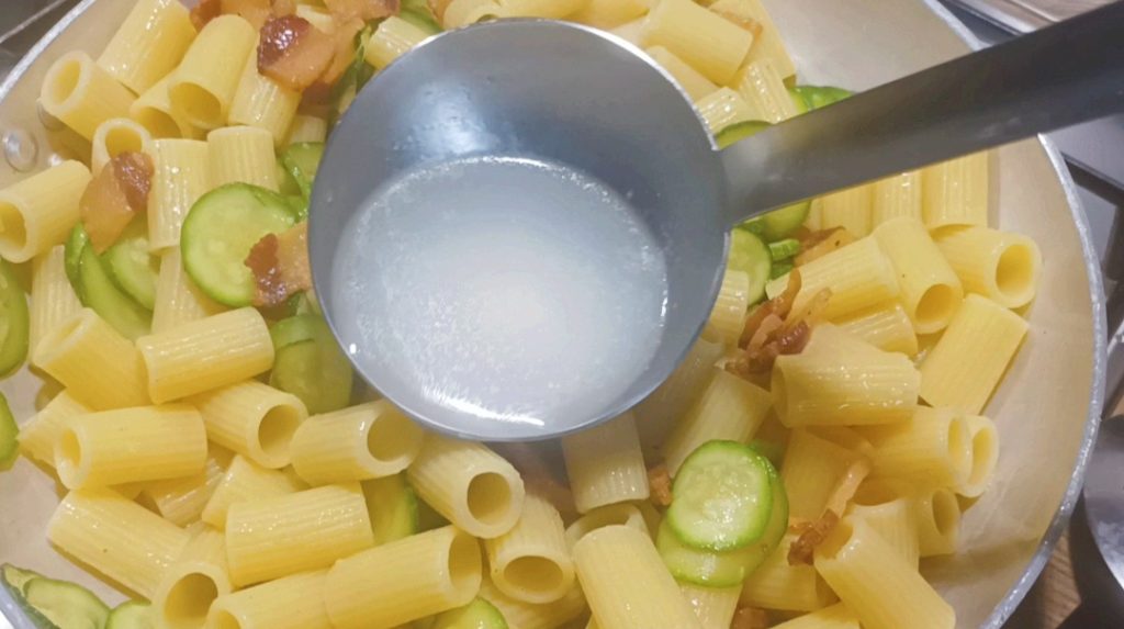 En este punto, cocina la pasta, pero escúrrela 3 minutos antes del término de la cocción conservando un poco de agua que añadirás a los calabacines.