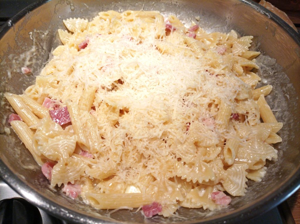 Pasta con nata y jamón…¡quién no la ha preparado al menos una vez! Uno de los primeros platos más simples en absoluto, pero también muy sabroso. Es una de esas preparaciones que nos resuelve un almuerzo rápido y que hace felices incluso a los niños, de hecho, precisamente para mi pequeño preparé esta receta con el formato de pasta que deseaba….y salió una mezcla con penne rigate y farfalle!! No se necesitan explicaciones particulares para esta receta ni ingredientes imposibles de encontrar…solo nata, jamón cocido, parmesano y para quien no lo haya probado nunca, recomiendo una ralladura de cáscara de limón, lo hará más particular y fragante. A veces se busca platos particulares, pero también se necesita un poco de simplicidad….!! A vosotros la receta