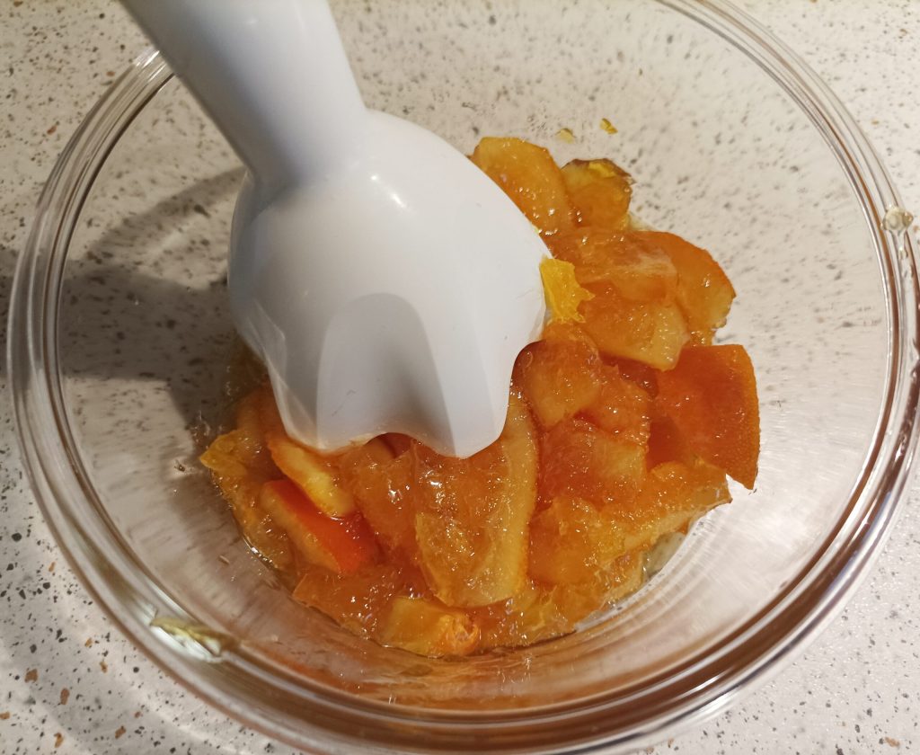 Al terminar la cocción, transfiere las naranjas a un recipiente y tritura todo finamente.