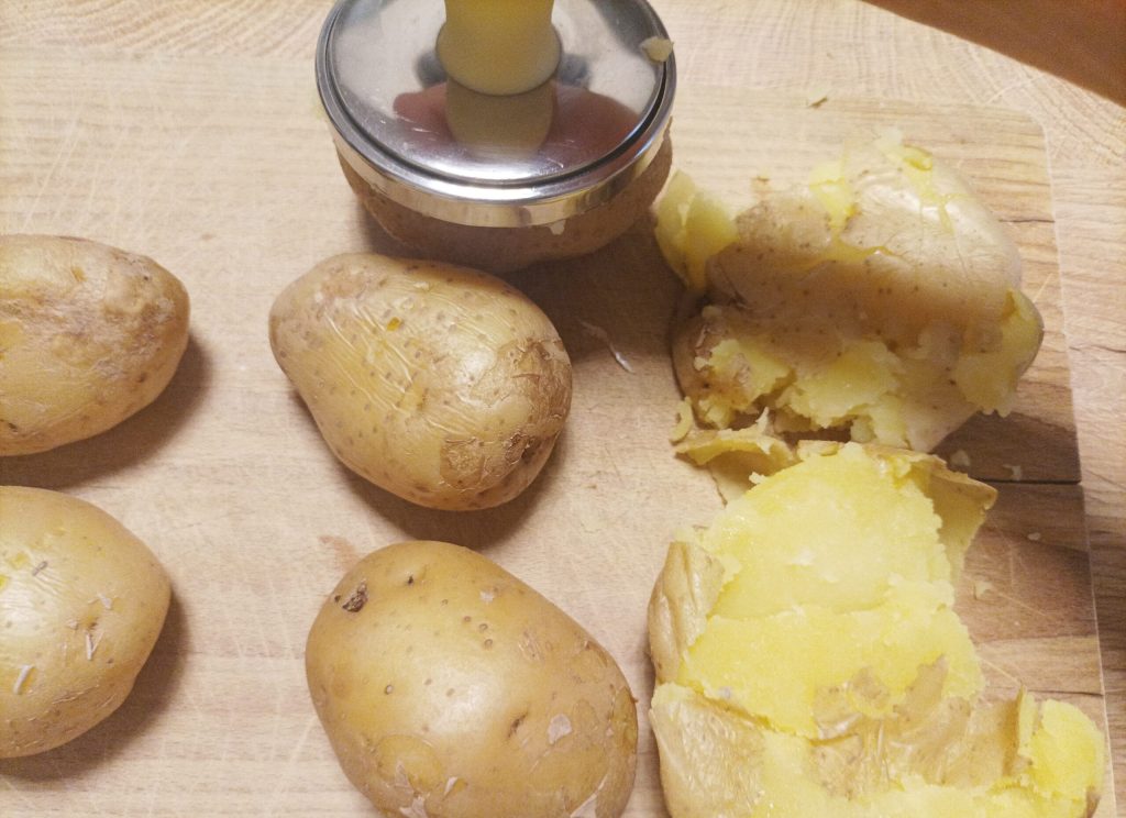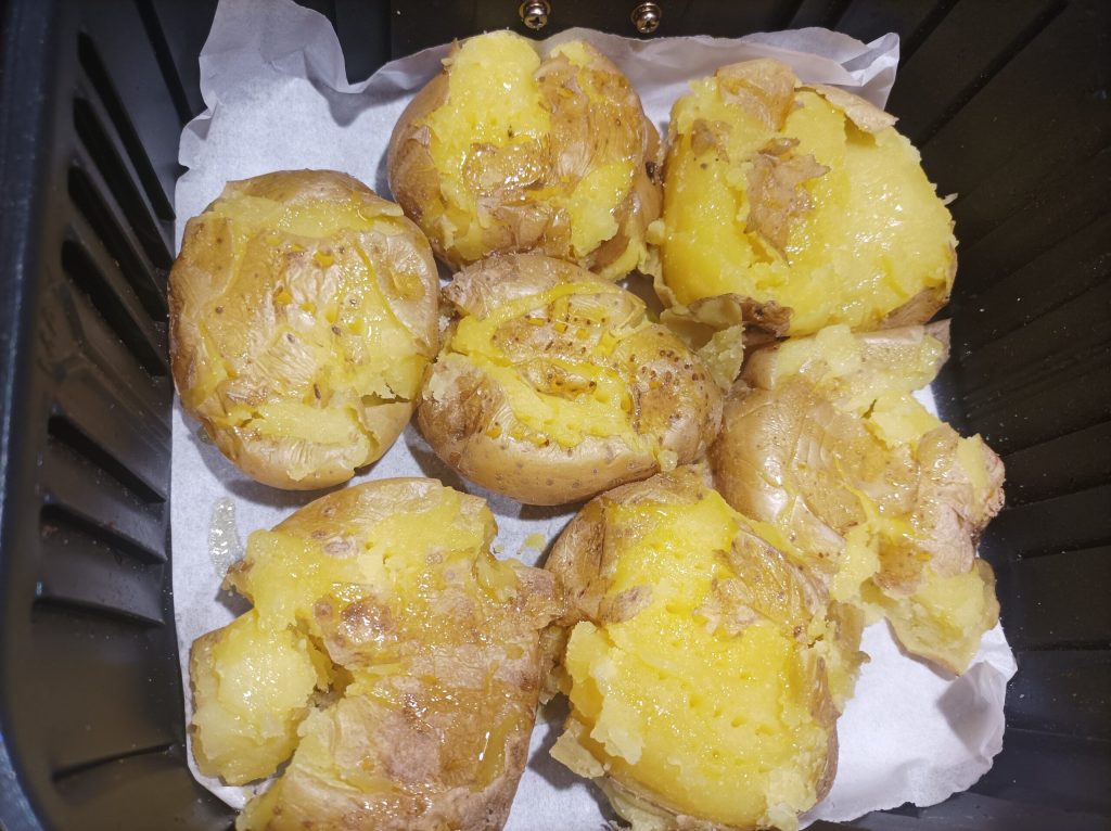 Cuando estén listas, con el machacador presiona las patatas delicadamente hasta abrirlas. Con el papel de horno cubre la bandeja del horno o una cazuela, o puedes cocinarlas en una freidora de aire como hice yo, condimenta con aceite y sal y hornea a 190° durante unos 20 minutos, deben quedar crujientes por fuera y doradas.
