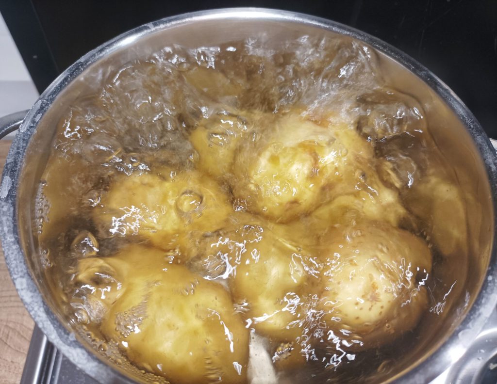Cuando el agua empiece a hervir, añade la sal y cocina durante unos 20 minutos. Comprueba la cocción con los dientes del tenedor porque podría variar según el tamaño de las patatas, si entran fácilmente estarán listas.