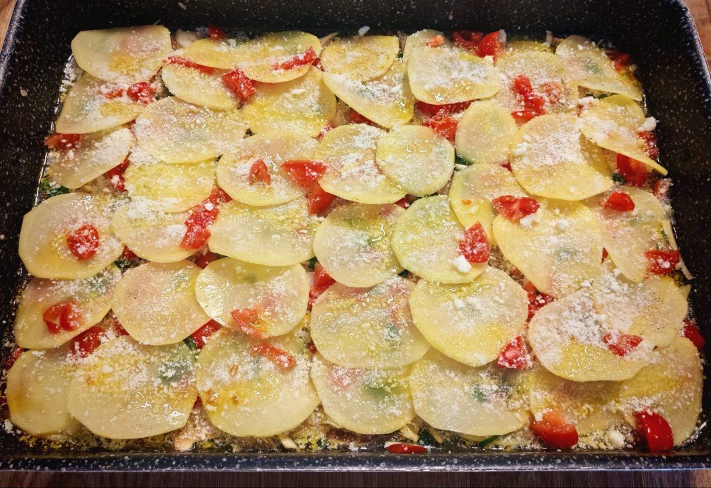Luego, colocad las patatas una al lado de la otra, escurrid y enjuagad las alcachofas y ponedlas sobre las patatas. Añadid el arroz escurrido sobre las alcachofas. Ahora sazonad nuevamente con aceite, pecorino, sal, pimienta, tomatitos, cebolla y perejil. Cubrid todo con el resto de las patatas, también una al lado de otra, los tomatitos, el pecorino, la sal y el aceite. Verted agua desde una esquina de la bandeja hasta el nivel de las patatas.