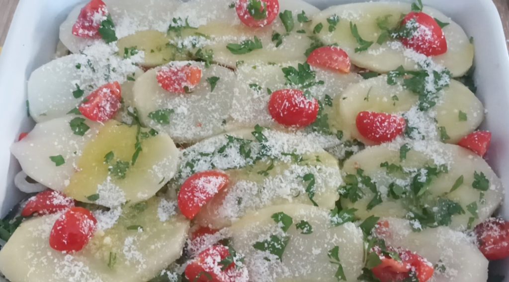En este punto, vuelve a empezar con todos los ingredientes, parmesano, aceite, cebolla, tomatitos, perejil, sal y pimienta. Luego cubre con otra capa de patatas.