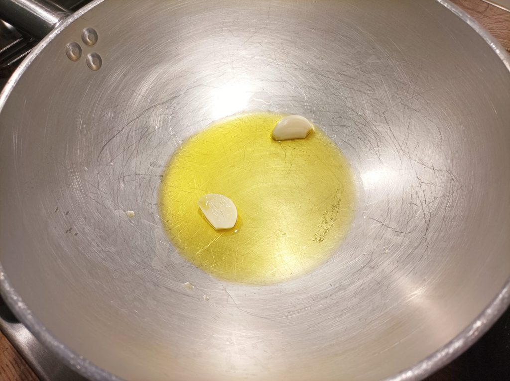 Transcurrido el tiempo, quitad el ajo y añadid el salmón, dejad sazonar 5 minutos y apagad el fuego.