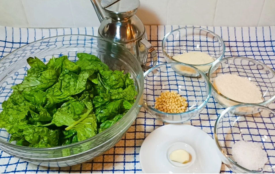 El pesto alla genovese es una preparación típica de la región de Liguria. El pesto alla genovese es uno de esos condimentos para un primer plato de verano más utilizado, pero quien como yo prepara mucho se encuentra en invierno un primer plato rápido para cuando se está fuera de casa todo el día. Con esta fabulosa salsa se pueden condimentar no solo primeros platos, sino también acompañar carnes, pizzas, rellenar hojaldres o preparar una excelente tortilla. Los ingredientes para la preparación del pesto son albahaca, parmesano, pecorino, piñones, ajo, aceite y sal. Para hacer el pesto se usaba el mortero, todavía hoy hay quien lo utiliza, pero para facilitar la preparación he usado el picador, ¡así que con el uso de cuchillas, está buenísimo igual! ¡A ti la receta!