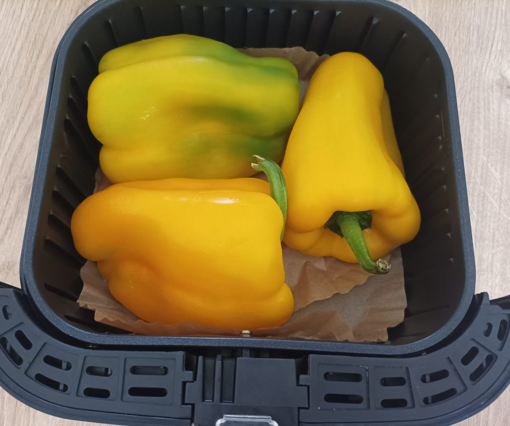 Primero, lava y seca los pimientos, coloca el papel de horno o directamente en el cestillo de la freidora de aire y coloca los pimientos.